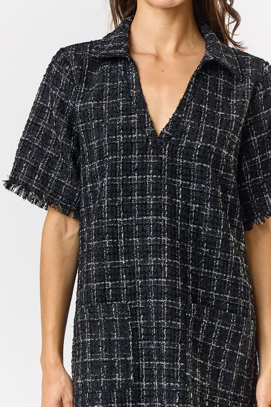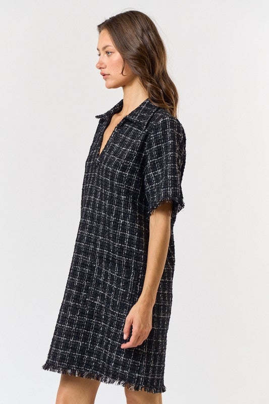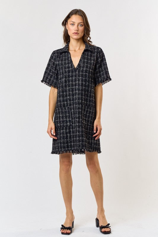 We offer shipping to any part of the world (Calculated on checkout)The DD4075 Black Tweed Block Dress is a must-have for the modern fashionista. This dress features a classic plaid tweed design with a stylish collared v-neck and a trendy frayed hem. Its mini length adds a touch of flirty charm, perfect for any occasion. Elevate your wardrobe with this timeless and versatile piece.