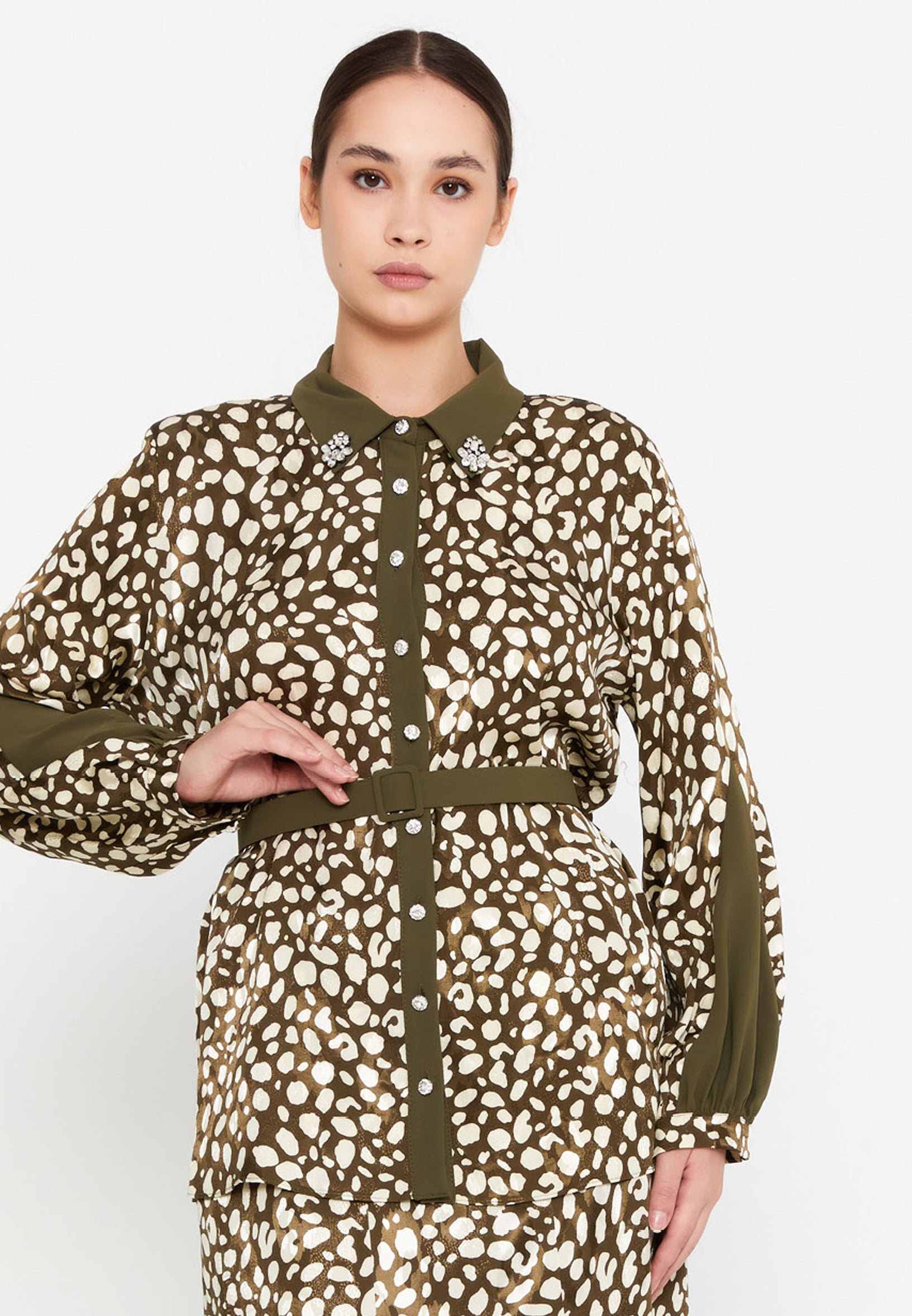 Expertly crafted with a fabric blend of 64% polyester and 33% viscose, our DD5122 Green Spot Print Blouse offers a comfortable and breathable fit. Perfect for any occasion, its unique green spot print adds a touch of trendy style to your wardrobe.
