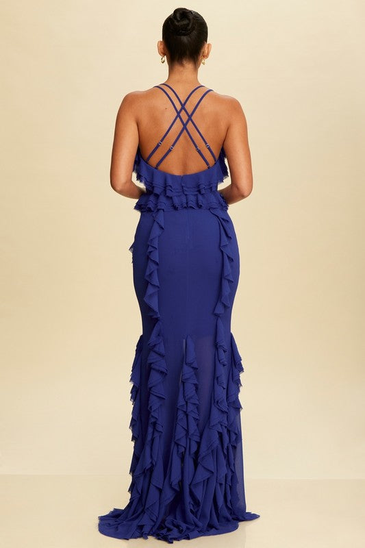 We offer shipping to any part of the world (Calculated on checkout)Update your summer wardrobe with our DD7008 Royal Blue Frill Maxi Dress. Made with 100% polyester, this dress features a raw ruffle hem for a flowy and romantic look. Stay comfortable and stylish all day with this elegant and versatile dress.