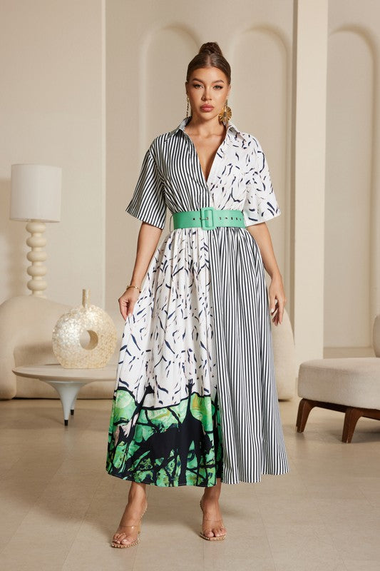 We offer shipping to any part of the world (Calculated on checkout)This multi-colored dress features a collar neckline and deep v-neck cut, with a button closure on the front for a chic touch. Made with 97% tencel and 3% spandex, the flowy fabric provides comfort and movement, while the adjustable belt offers a flattering fit. Elevate your wardrobe with this stylish and versatile piece.