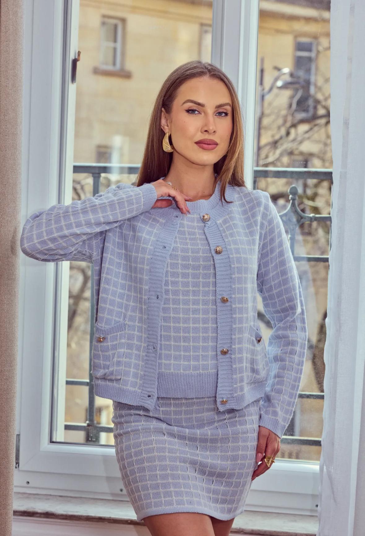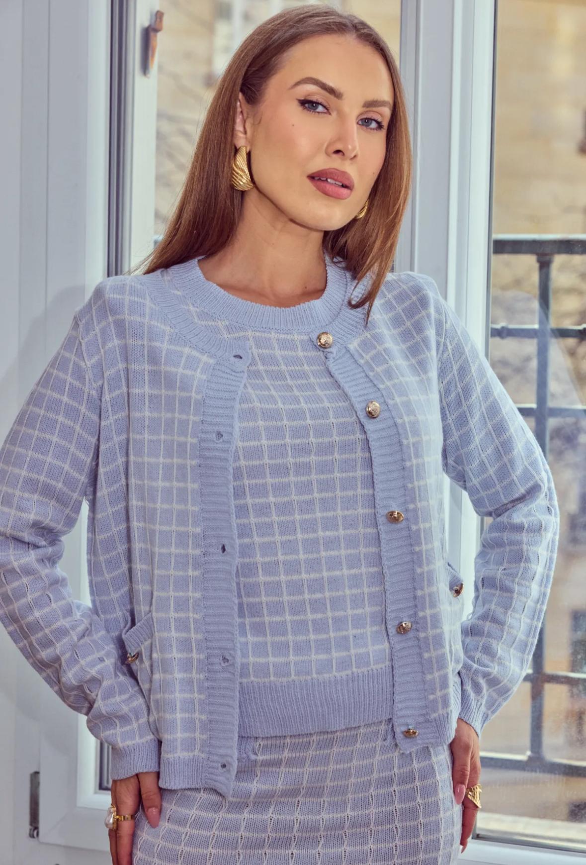 We offer shipping to any part of the world (Calculated on checkout)This GG1033 Blue Pastel Cardigan is made from 100% Acrylic, ensuring a soft and cozy feel. The plaid knit design adds a stylish touch, while the long sleeves provide warmth and comfort. Perfect for a chilly day or a cozy night in.
