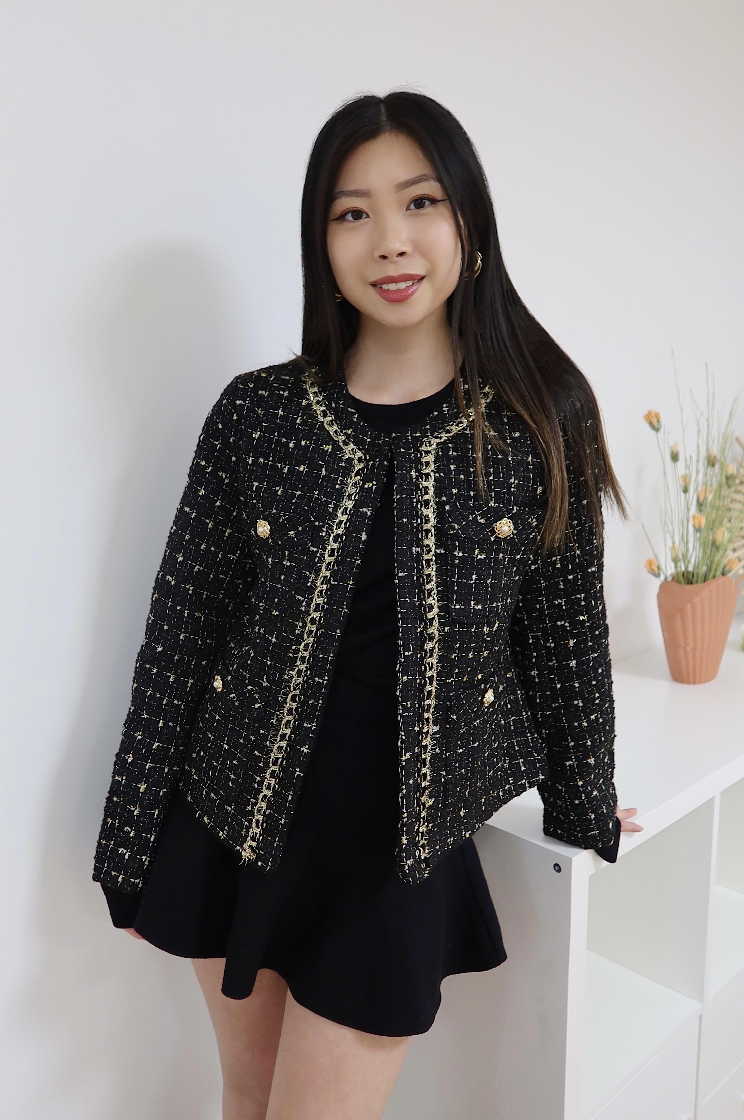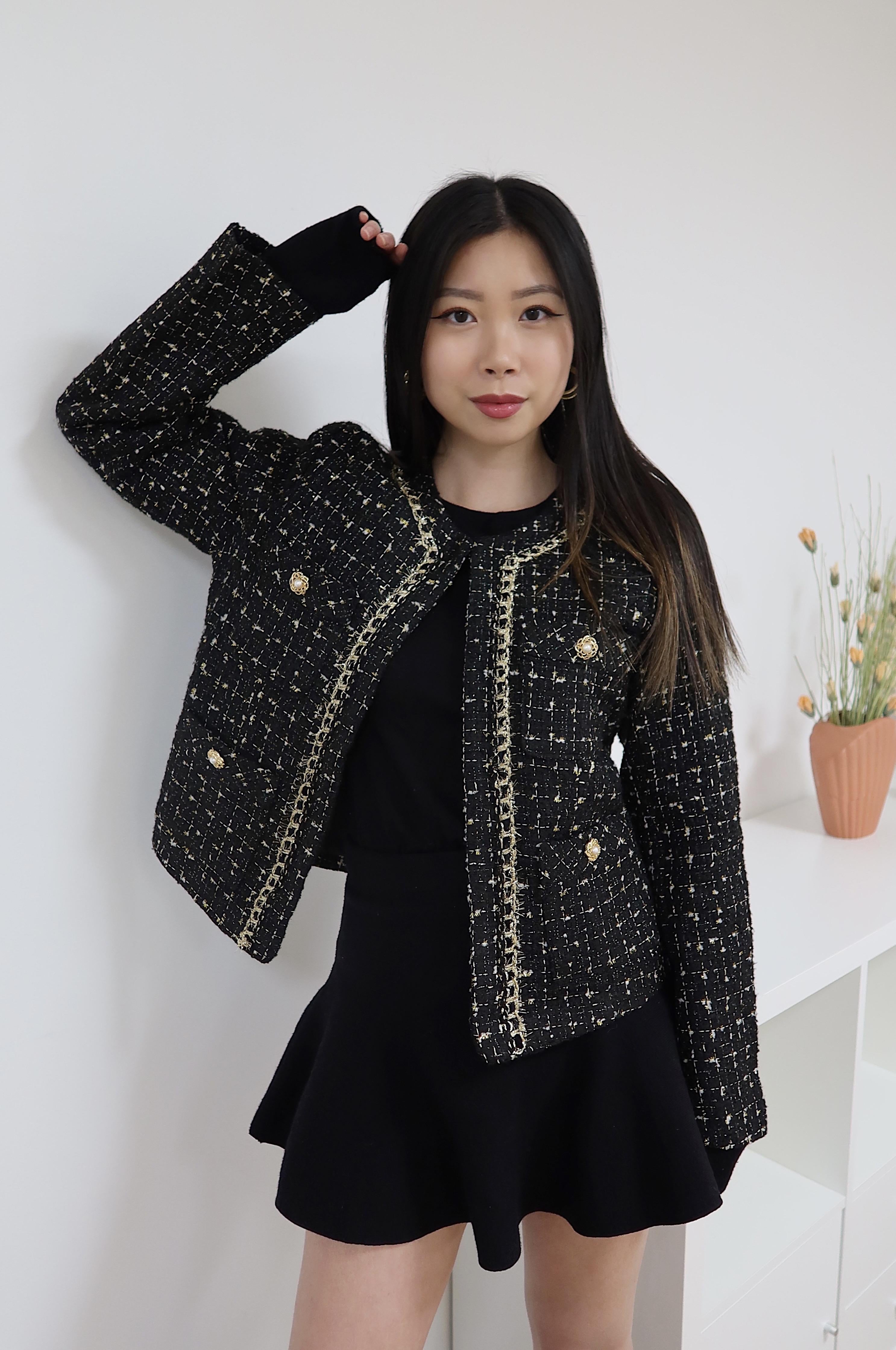 We offer shipping to any part of the world (Calculated on checkout)This GG1035 Black Tweed Jacket is made of 100% Polyester, ensuring durability and easy care. The plaid print and long sleeves add a touch of style and versatility to this classic design. Perfect for any occasion, this jacket is a must-have for your wardrobe.