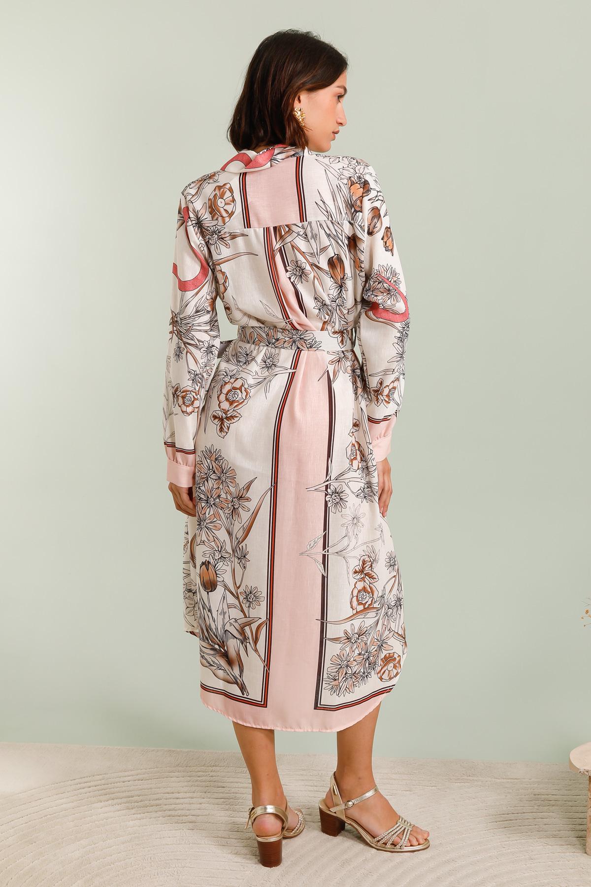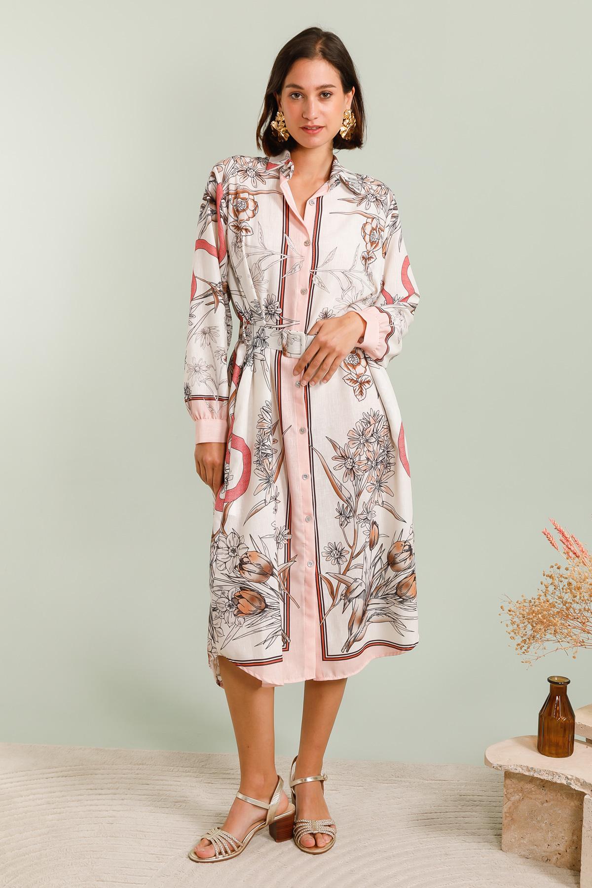 We offer shipping to any part of the world (Calculated on checkout)This elegant midi dress features a sophisticated pink floral print on a premium fabric blend of 50% viscose, 30% polyester, and 20% linen. The carefully balanced composition ensures breathability while maintaining structure and drape, making it ideal for both comfort and style throughout the day.