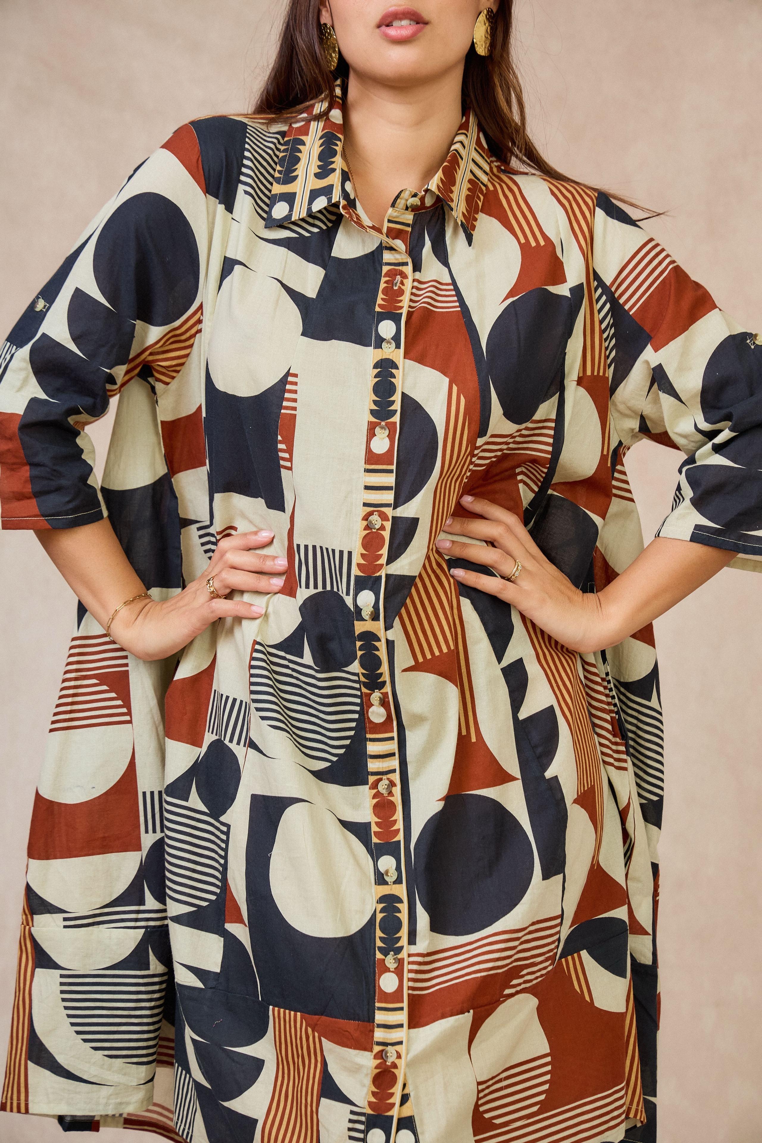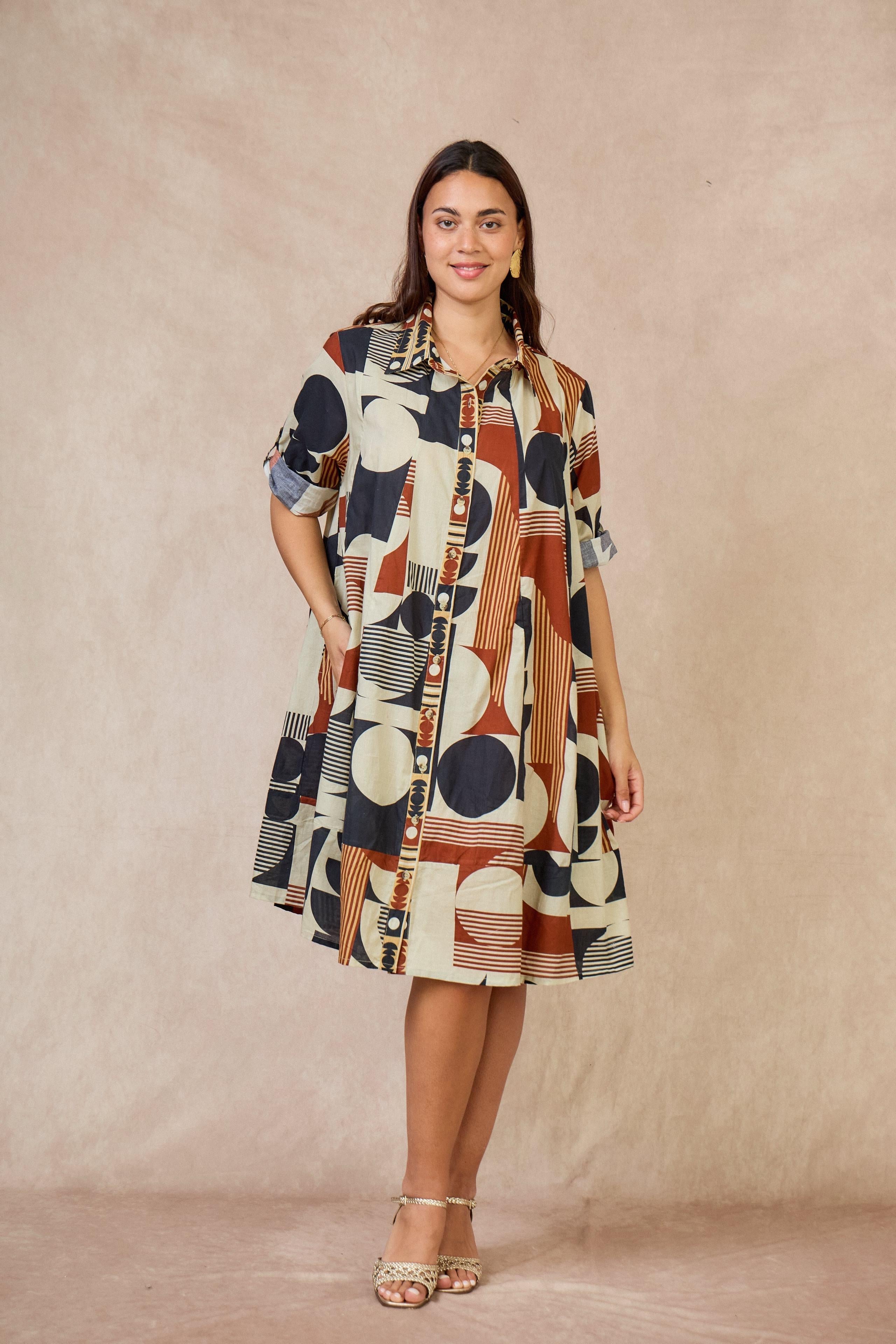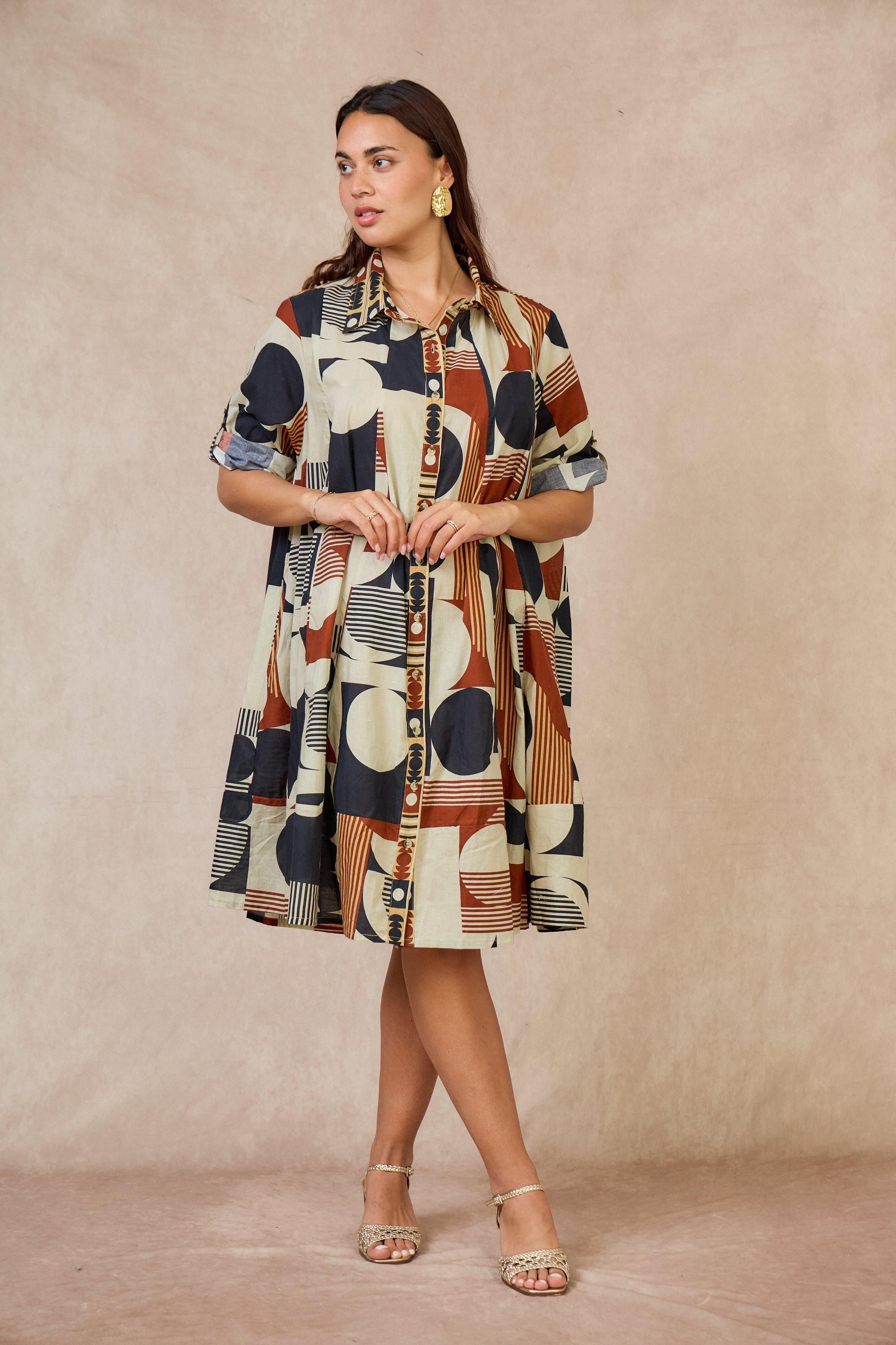 We offer shipping to any part of the world (Calculated on checkout)Crafted from 100% cotton, this Geo Print Shirt Dress offers breathable comfort with refined style. The flattering V-neck creates an elongating effect, while the 3/4 sleeves provide versatile coverage for transitional seasons. Thoughtful pleating adds dimension and movement to the silhouette, enhancing the geometric print pattern. This piece combines structural elegance with the practicality of natural fabric for a sophisticated yet comfortable wardrobe essential.