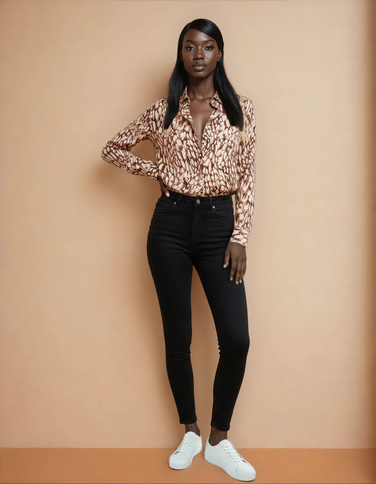 We offer shipping to any part of the world (Calculated on checkout)This sophisticated blouse combines 90% viscose with 10% polyamide for a refined balance of comfort and durability. The viscose delivers a luxurious drape and breathable wear, while the polyamide reinforcement ensures lasting shape retention and resilience. The brown spotted print adds timeless elegance to your wardrobe, making it versatile for both professional and casual settings. A wardrobe essential that prioritizes both style and practicality.