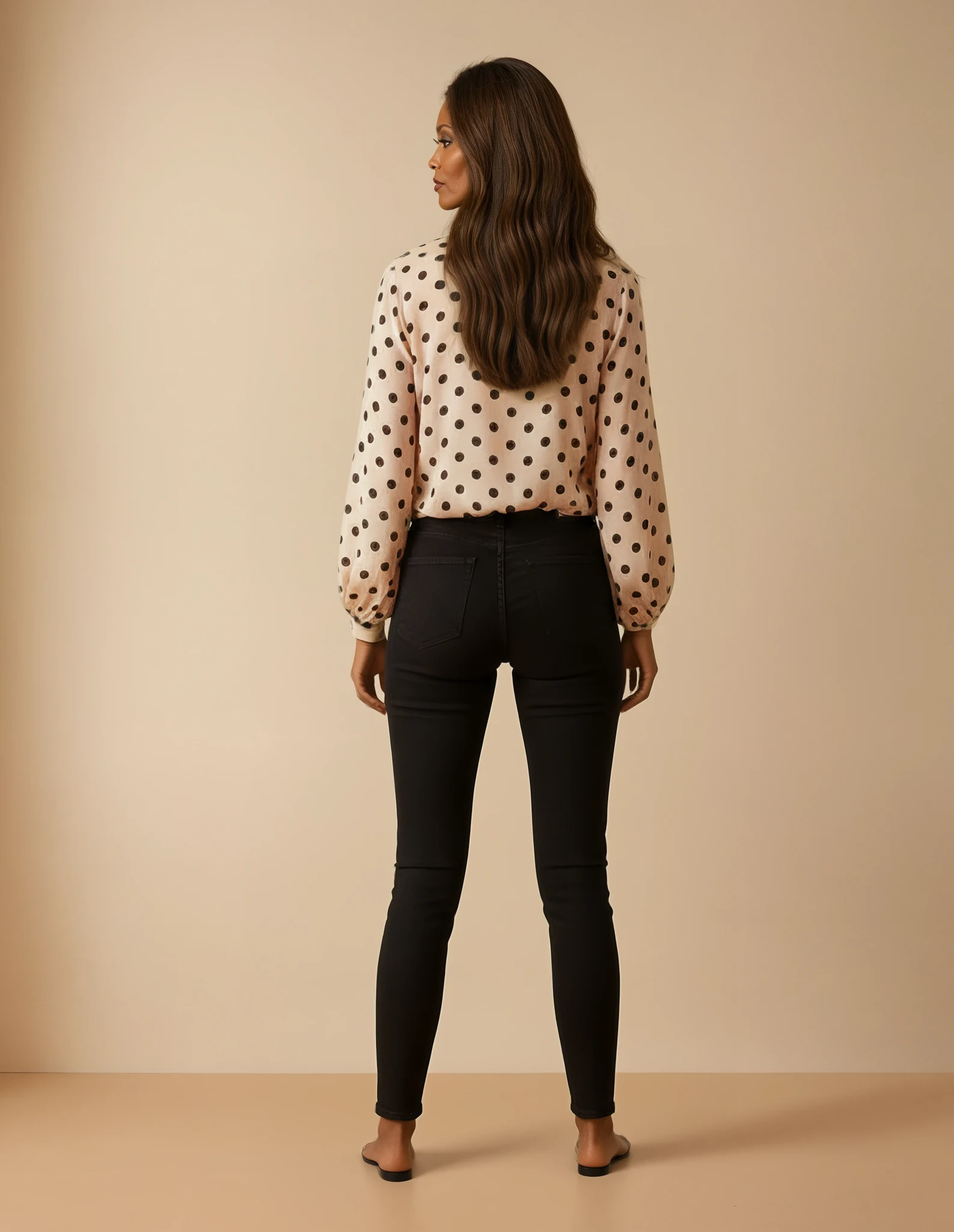 We offer shipping to any part of the world (Calculated on checkout)GG2031 Polk-A-Dot Blouse This sophisticated blouse combines premium fabric composition for optimal comfort and durability. The 50% polyester foundation provides structural integrity and wrinkle resistance, while 45% viscose delivers a luxurious drape and breathable wear. The 5% elastane ensures subtle stretch and recovery, allowing unrestricted movement throughout your day. The polka-dot pattern adds timeless elegance to your wardrobe, making this piece versatile for both professional and casual settings. A refined choice for those who value quality construction and refined aesthetics.