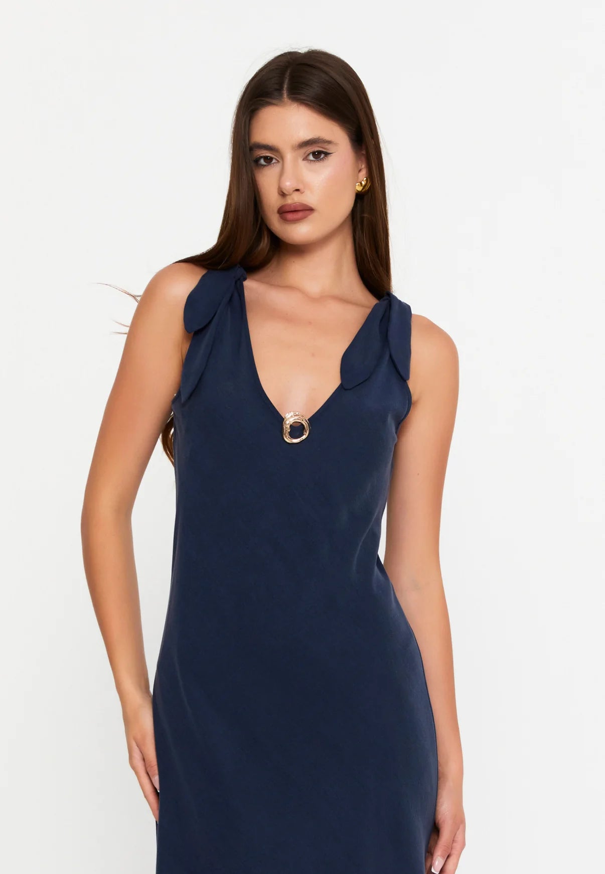 This navy blue linen midi dress offers a perfect blend of comfort and style for casual occasions. Crafted from breathable linen, it ensures a lightweight feel and natural ventilation, ideal for warm weather. Its midi length provides a versatile silhouette that can be dressed up or down, making it a practical addition to any wardrobe. The timeless navy hue adds sophistication while maintaining a relaxed vibe.