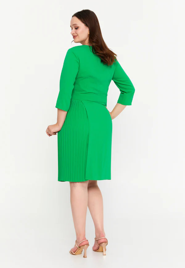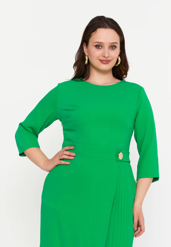 The GG3030 Green Pleated Official Dress is made from 100% polyester, offering a fabric that is both durable and easy to maintain. Its pleated design ensures a structured yet elegant silhouette, making it an excellent choice for professional settings where style and comfort are essential.