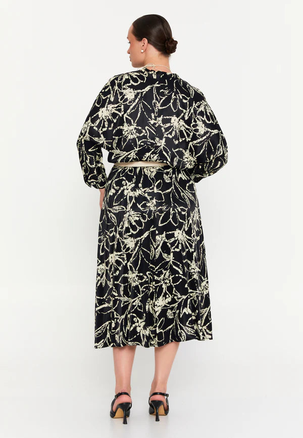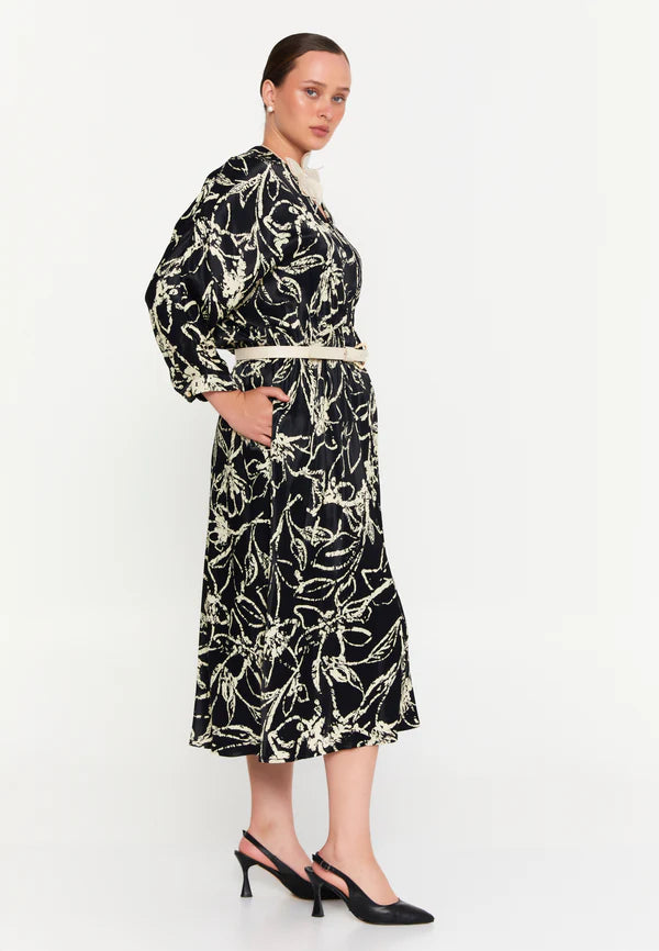 The GG3044 BW Floral Midi Dress is crafted from smooth satin fabric, offering a luxurious sheen and elegant drape. Its black and white floral pattern provides a timeless, sophisticated aesthetic, while the midi length ensures a versatile silhouette suitable for both formal and semi-formal occasions. This dress combines refined style with comfortable wearability.