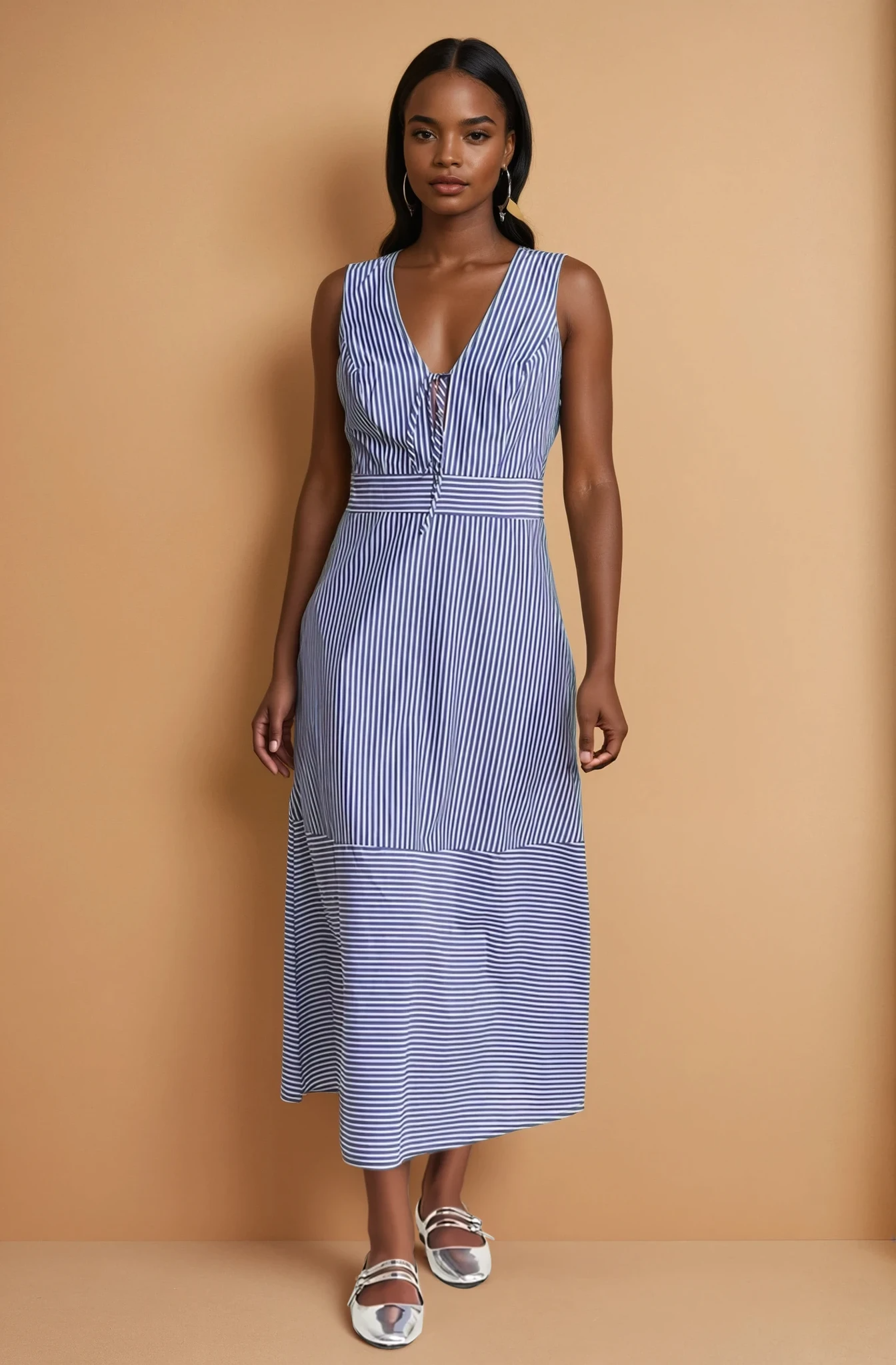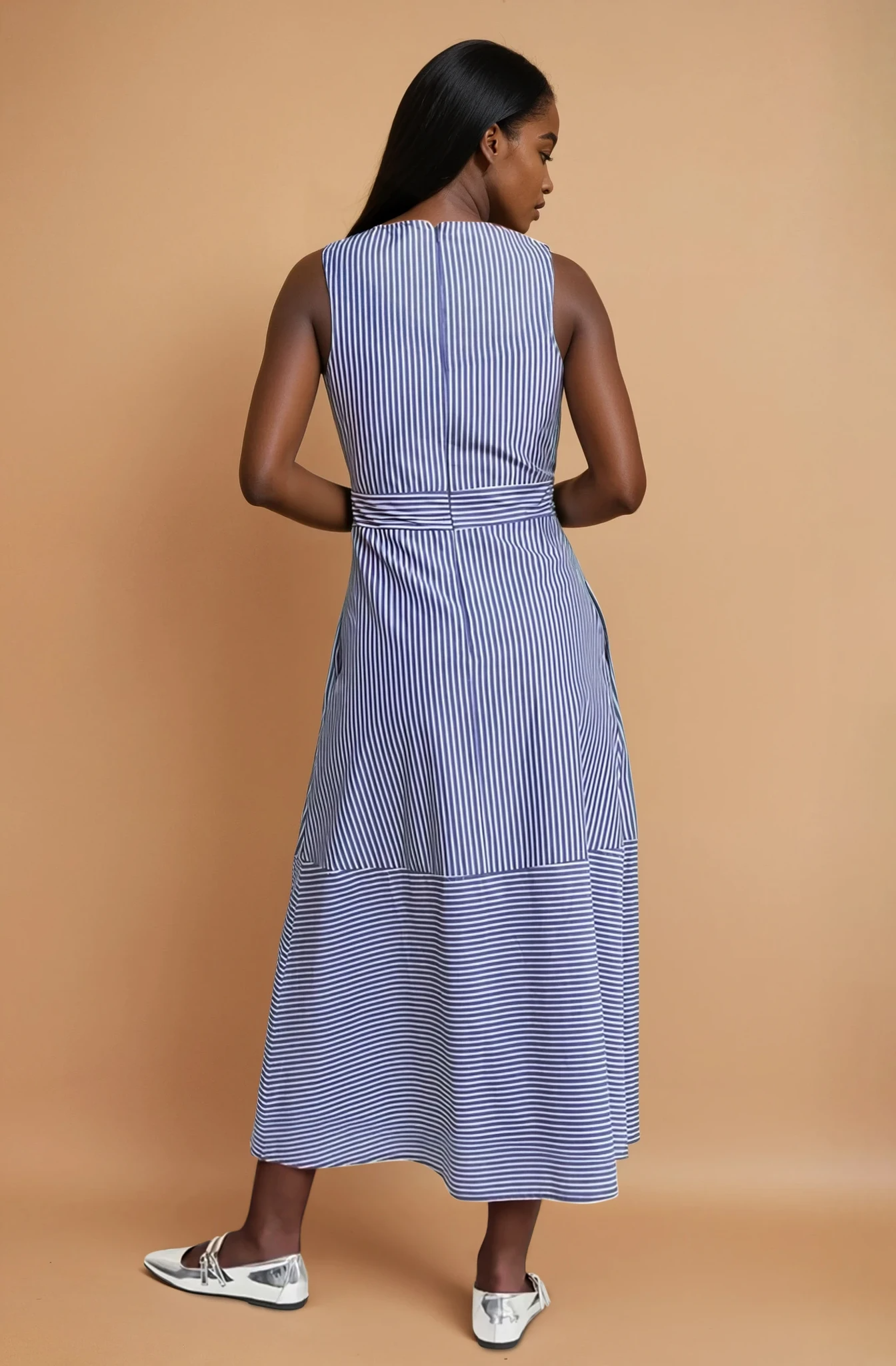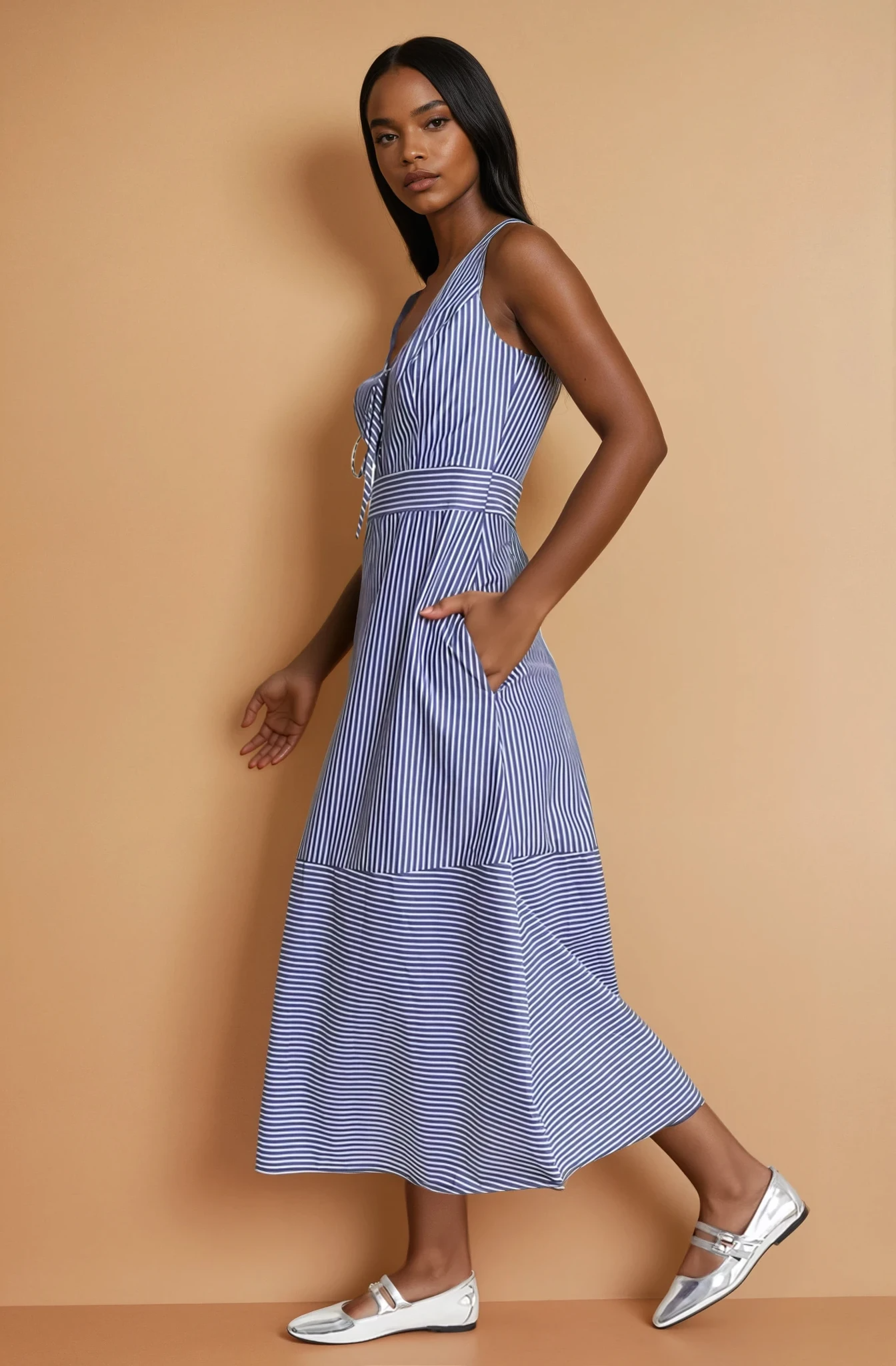 We offer shipping to any part of the world (Calculated on checkout)The GG4017 V Neck Sleeveless Midi Dress is crafted from 100% cotton, ensuring breathability and natural comfort. Featuring a flattering V-neck with a keyhole front, sleeveless design, and a stylish front tie detail, it combines elegance with a relaxed fit. The striped pattern adds a contemporary touch, while the midi length offers versatility for both casual and dressier occasions. This dress balances sophisticated design with everyday wearability.