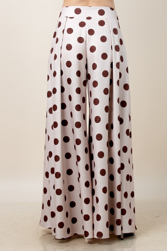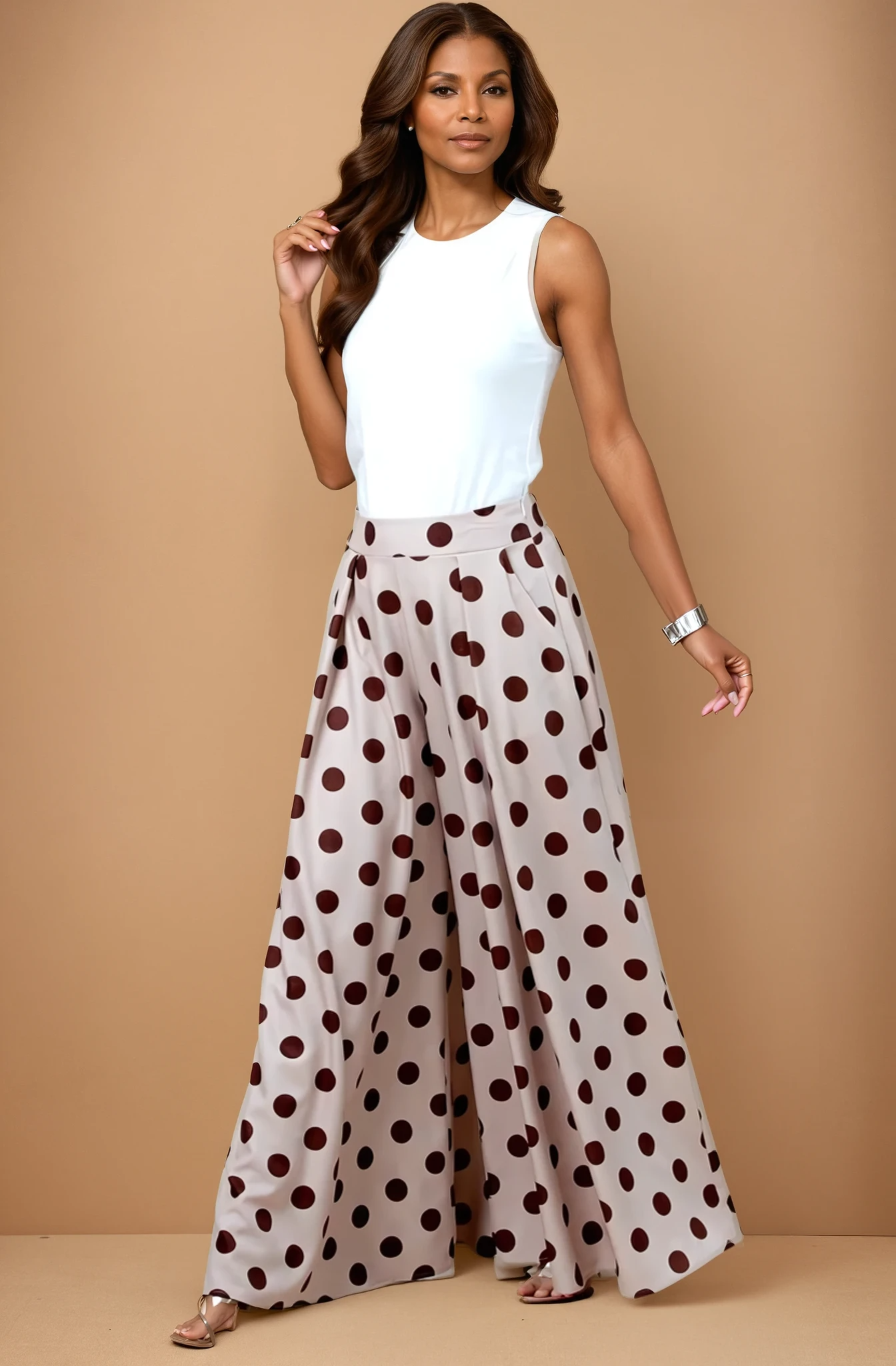We offer shipping to any part of the world (Calculated on checkout)These Lidia Choco Polka Dot wide-leg palazzo pants blend timeless elegance with modern comfort. Designed with a spacious wide-leg cut and crafted from high-quality fabric, they offer effortless movement and a flattering silhouette. The classic chocolate base adorned with subtle polka dots adds a playful yet sophisticated touch, making these pants versatile for both casual and dressier occasions.