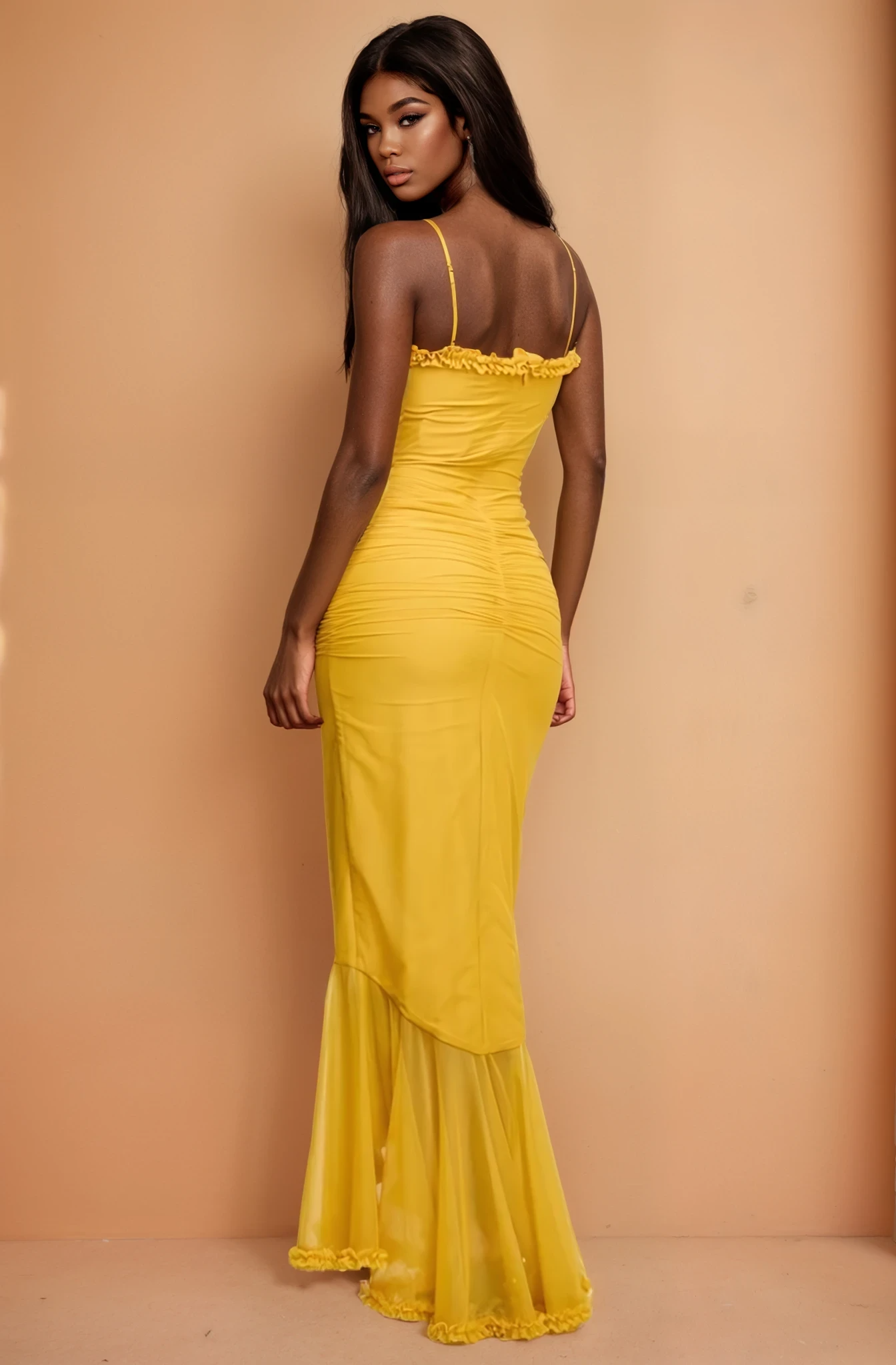 GG4104 Mustard Shirred Mesh Ruffle Maxi Dress
