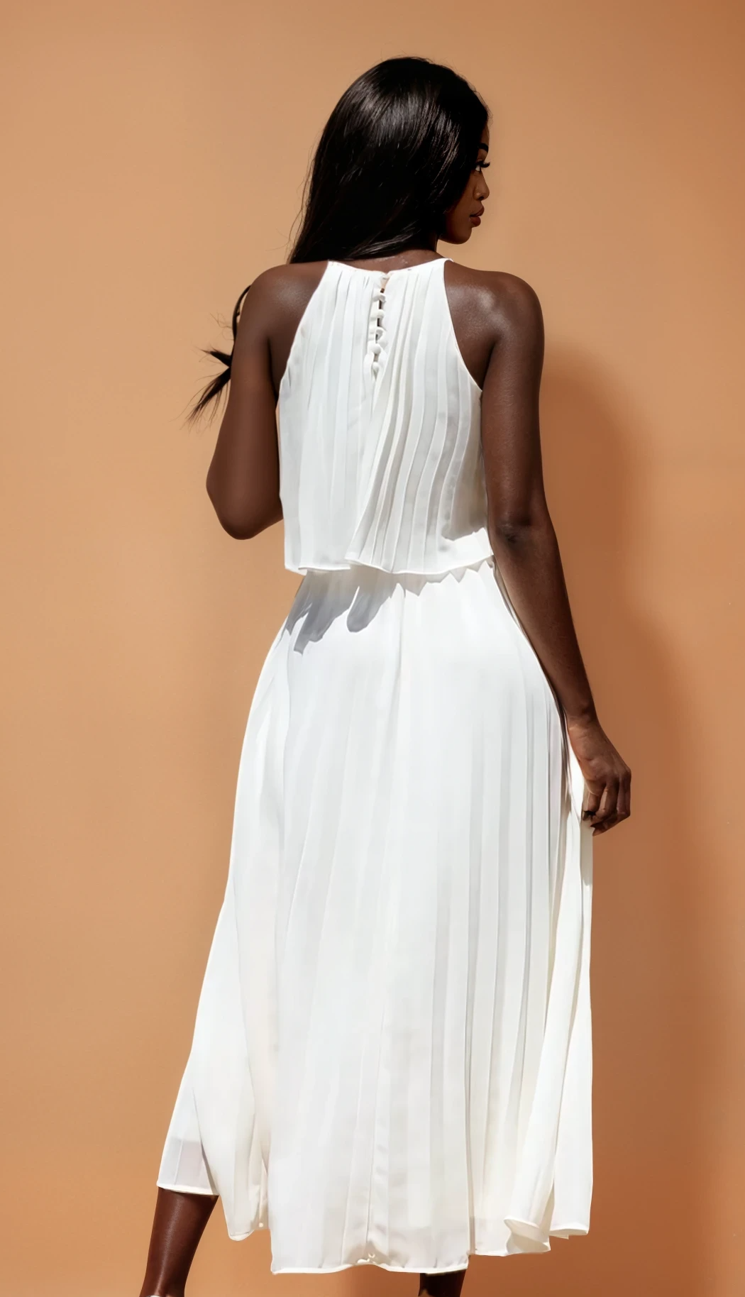 This cream pleated midi dress offers a sophisticated silhouette with its elegant pleats and comfortable elastic waist, ensuring a flattering fit. Designed with a lined interior for smooth wear, it suits a range of body shapes. The model is 5'5" (34"/24"/35") and wears a size Small, demonstrating the garment’s tailored yet adaptable cut. Ideal for both formal and casual occasions, this dress combines style with ease.