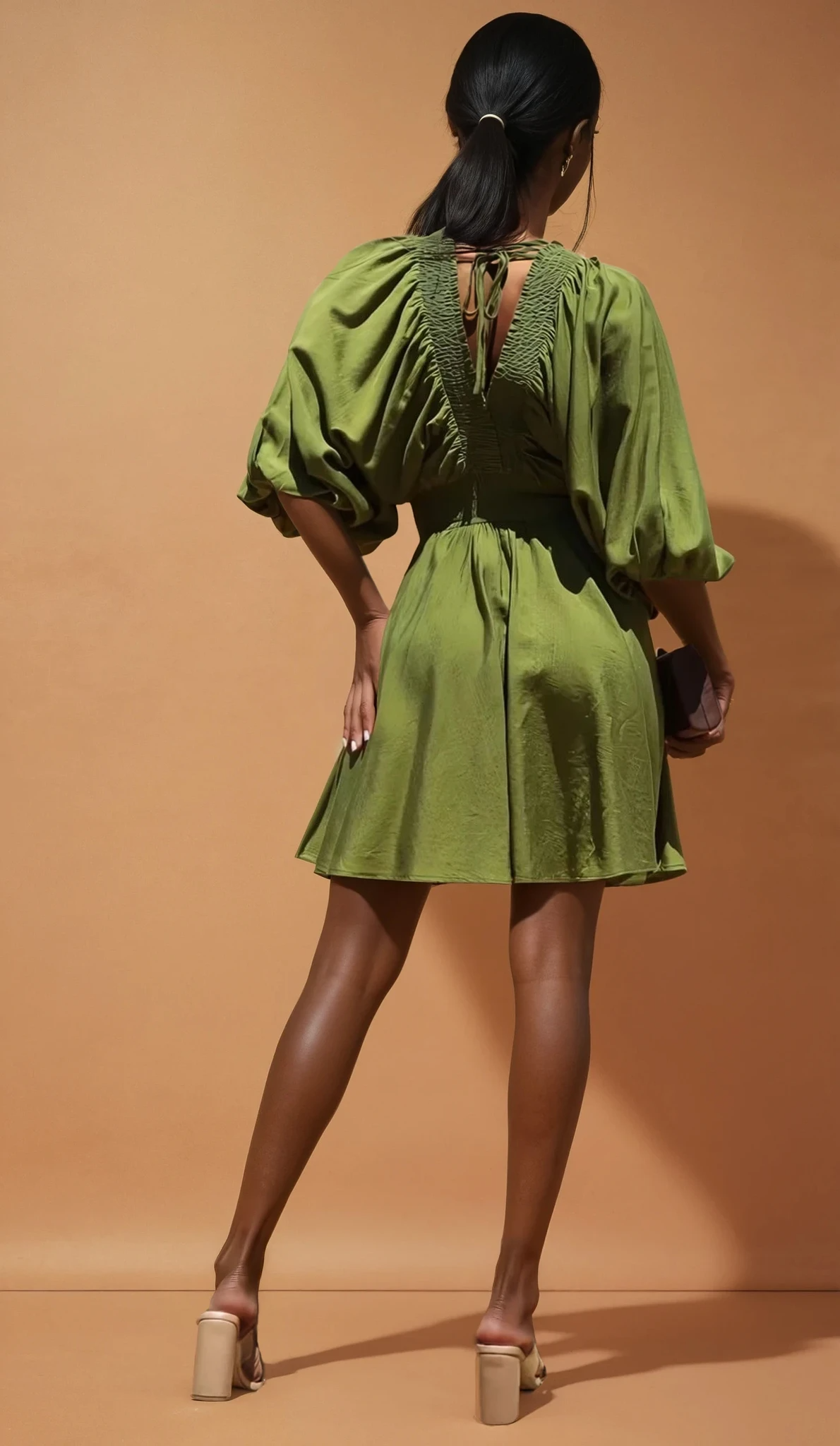 We offer shipping to any part of the world (Calculated on checkout)The GG4125 Olive Smocked Woven Mini Dress features detailed smocking that shapes the silhouette for a comfortable yet form-fitting look. Crafted from breathable woven fabric, this dress offers both style and ease, making it perfect for a variety of occasions. The model, measuring 5'5" (34"/24"/35"), wears a size Small, demonstrating its tailored design that complements different body types effortlessly.