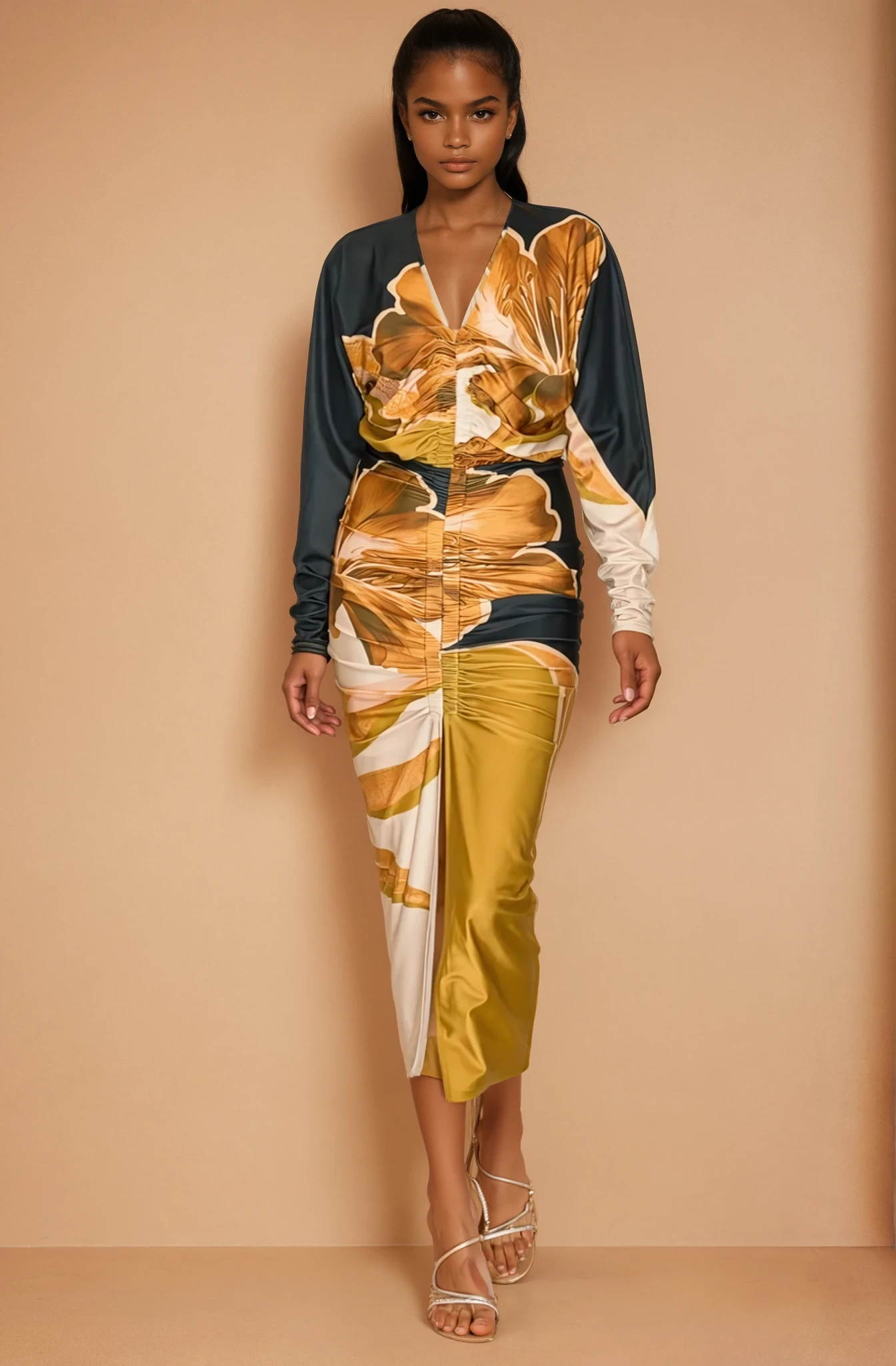 This V-neck midi dress features a delicate floral effect print and a ruched center front with gathered detailing, creating a flattering silhouette. Made from stretchy, soft jersey fabric, it ensures comfort and ease of movement. The design includes a bold front slit for an elegant and daring touch. The model is 5'7" and wears a size Small, offering a tailored fit suitable for both day and evening occasions.