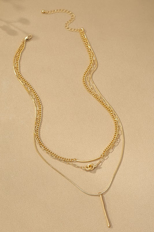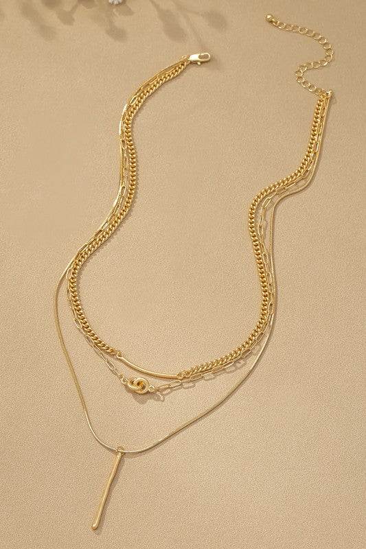 We offer shipping to any part of the world (Calculated on checkout)This sophisticated 3-row mixed chain features a unique combination of three distinct designs: a Cuban chain accented with a curved bar, a delicate paper clip chain enhanced by a subtle knot, and a sleek snake chain finished with an elongated stick. Each element is expertly crafted to provide texture and visual contrast, offering a refined accessory that elevates any ensemble with a modern, layered look. Perfect for those who appreciate intricate details and versatile elegance.
