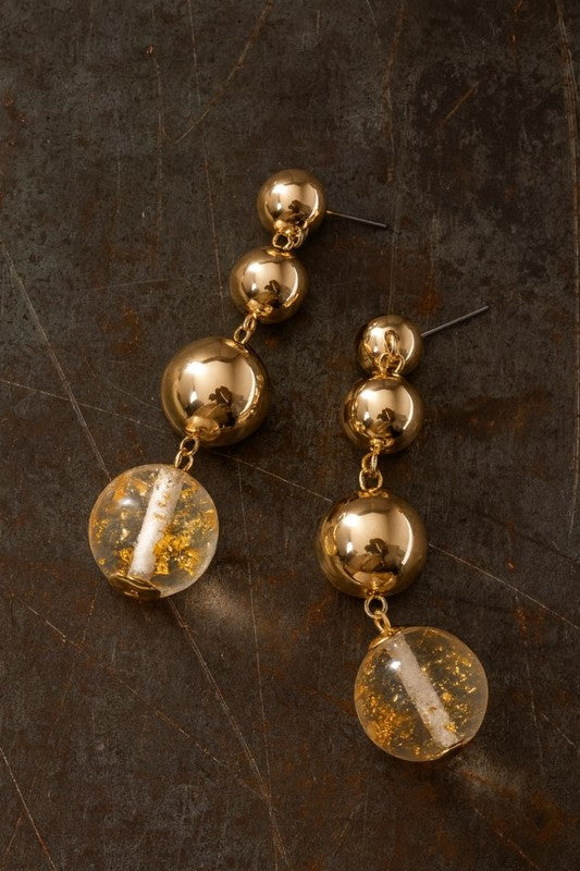 We offer shipping to any part of the world (Calculated on checkout)The GG4145 Gold Ball Drop Earrings showcase an elegant cascade of polished gold-tone alloy balls, accented by a clear resin globe embedded with delicate gold foil flakes. Measuring 7.1 cm in length, with a 1.7 cm resin globe, these earrings offer a refined shimmer and eye-catching movement. Featuring a secure post-back closure, they provide both comfort and style. Perfect for adding a sophisticated touch to casual looks or enhancing evening ensembles. Made with ccb plastic balls, resin, and shiny gold plating for lasting brilliance.