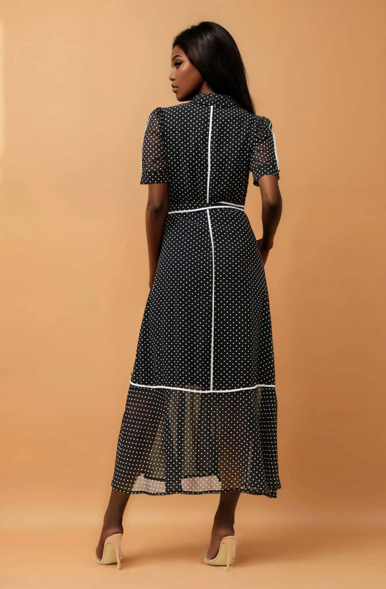 We offer shipping to any part of the world (Calculated on checkout)This ethereal maxi dress showcases delicate polka dot detailing on lightweight polyester chiffon, creating an enchanting semi-sheer aesthetic ideal for layering or confident styling. The fluid fabric drapes gracefully, offering movement and comfort throughout the day or evening. Fully lined in polyester for seamless wear, this piece transitions effortlessly from casual gatherings to sophisticated events. The timeless polka dot pattern adds vintage-inspired charm to a modern silhouette. Model pictured is 5'9" wearing size S.